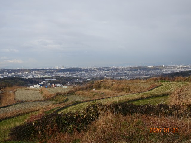 山道をもくもくと歩き、大阪平野を眺めます。